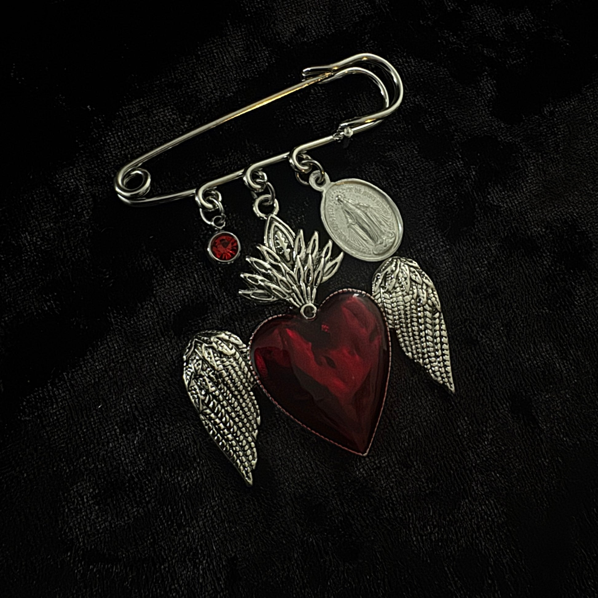 Inspirées des colliers grigris, ces épinglettes sont composées de breloques d'art sacré soigneusement choisies.