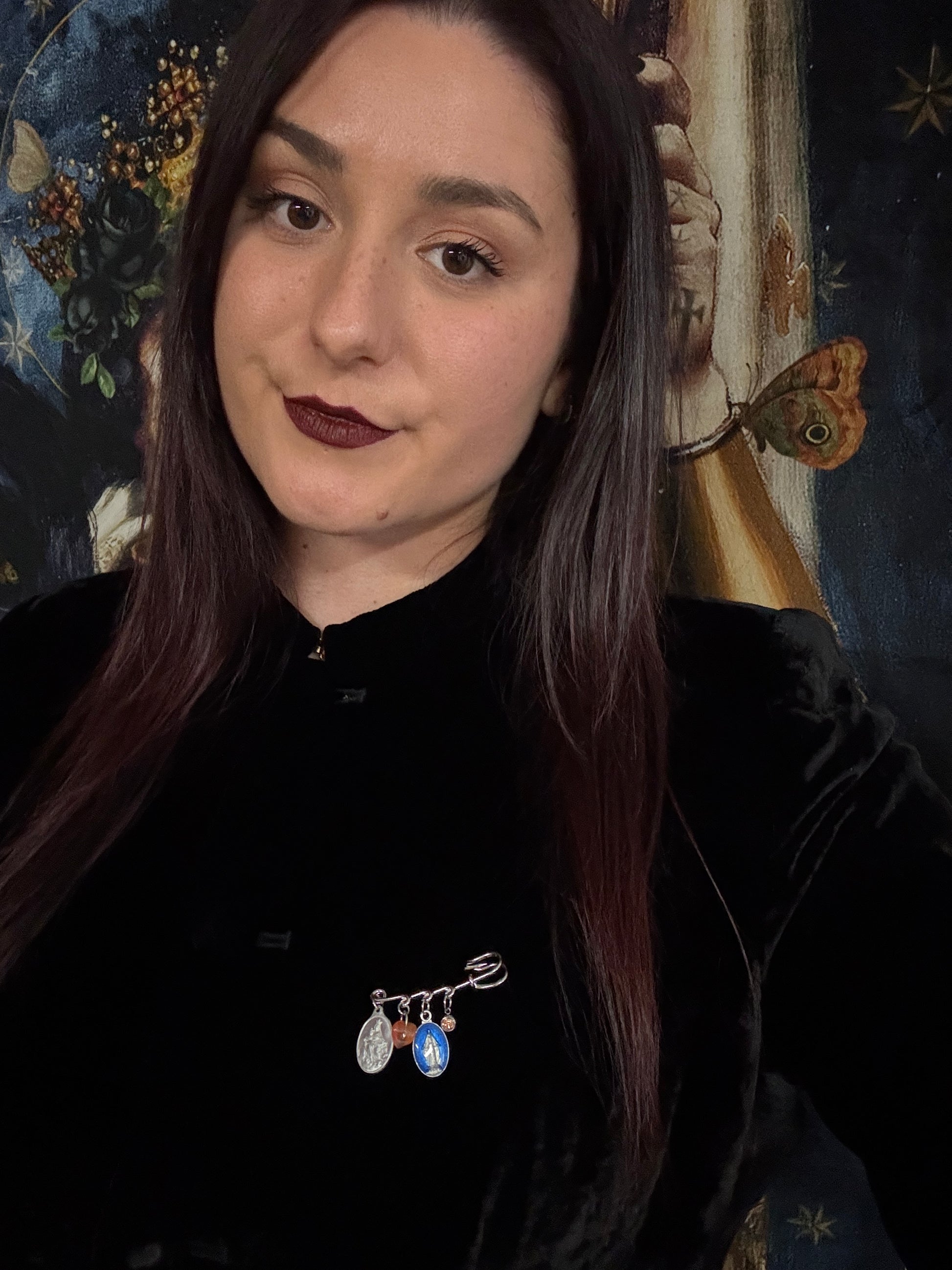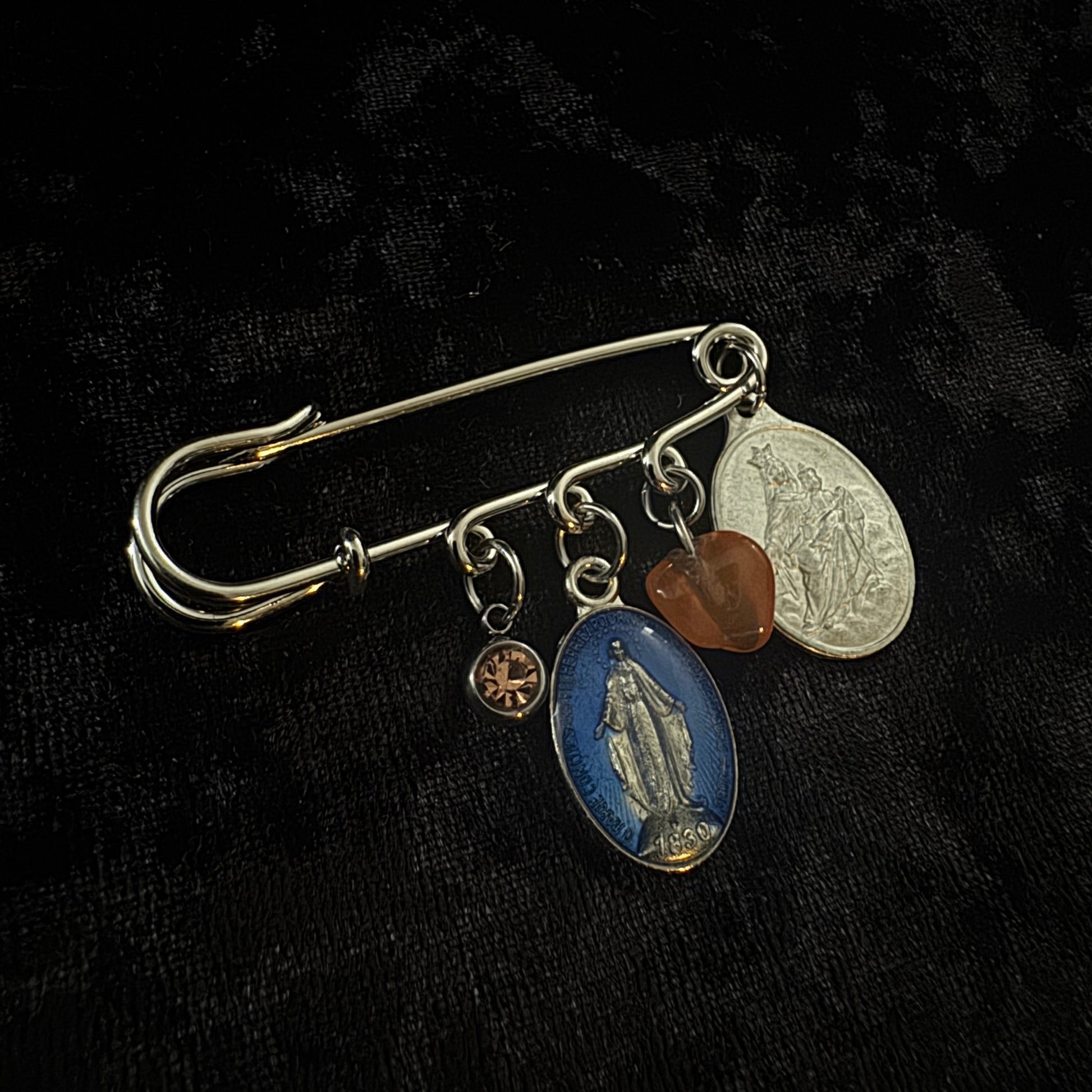 Inspirées des colliers grigris, ces épinglettes sont composées de breloques d'art sacré soigneusement choisies.