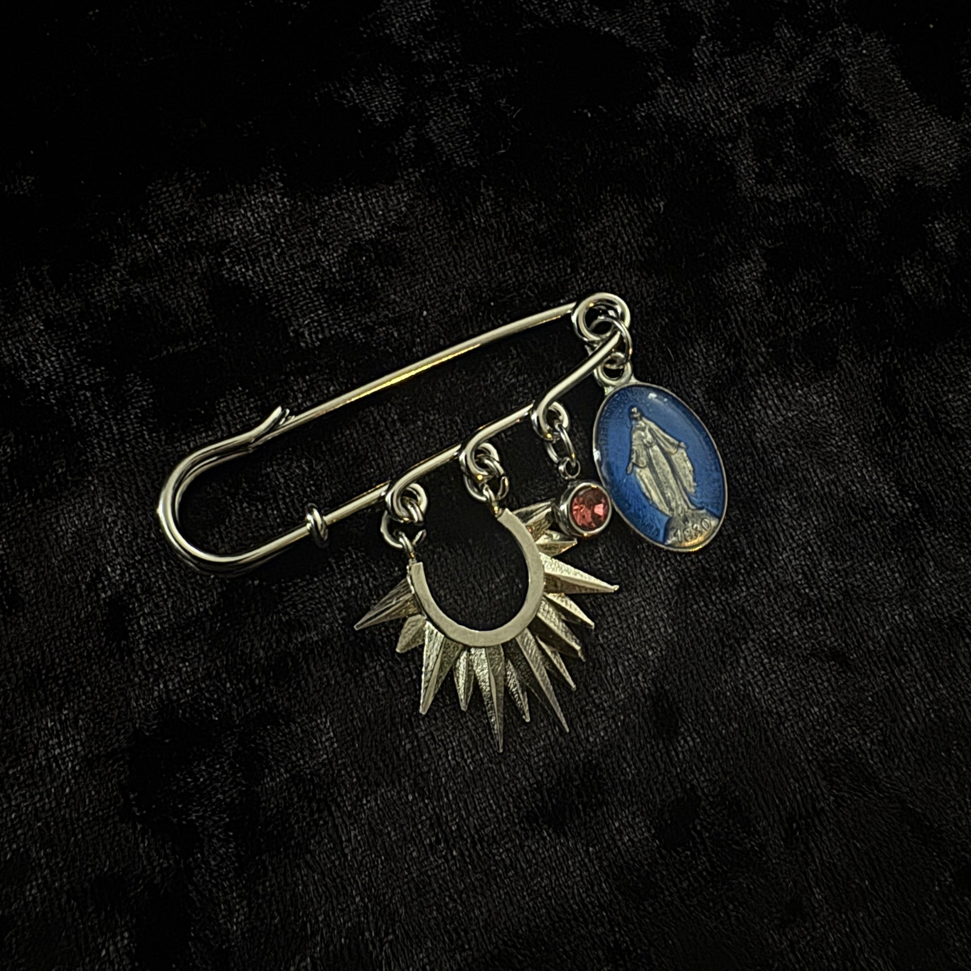 Inspirées des colliers grigris, ces épinglettes sont composées de breloques d'art sacré soigneusement choisies.